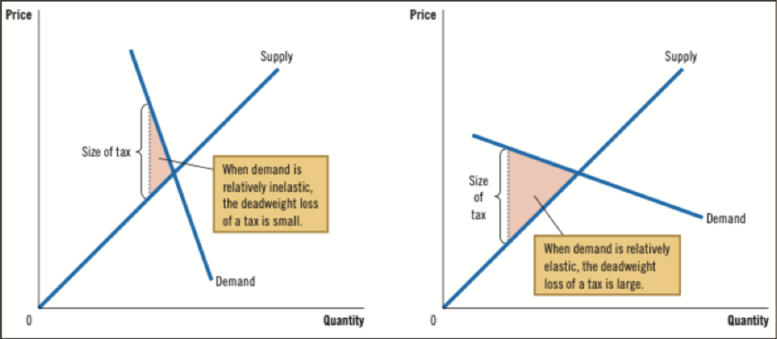 La taxe impacte une perte de surplus des producteurs et des consommateurs (voir le cours précédent). Plus l'offre est élastique, la perte sèche (du surplus) est plus élevé. Si elle est inélastique, la perte est moindre (car le producteur prend cher)