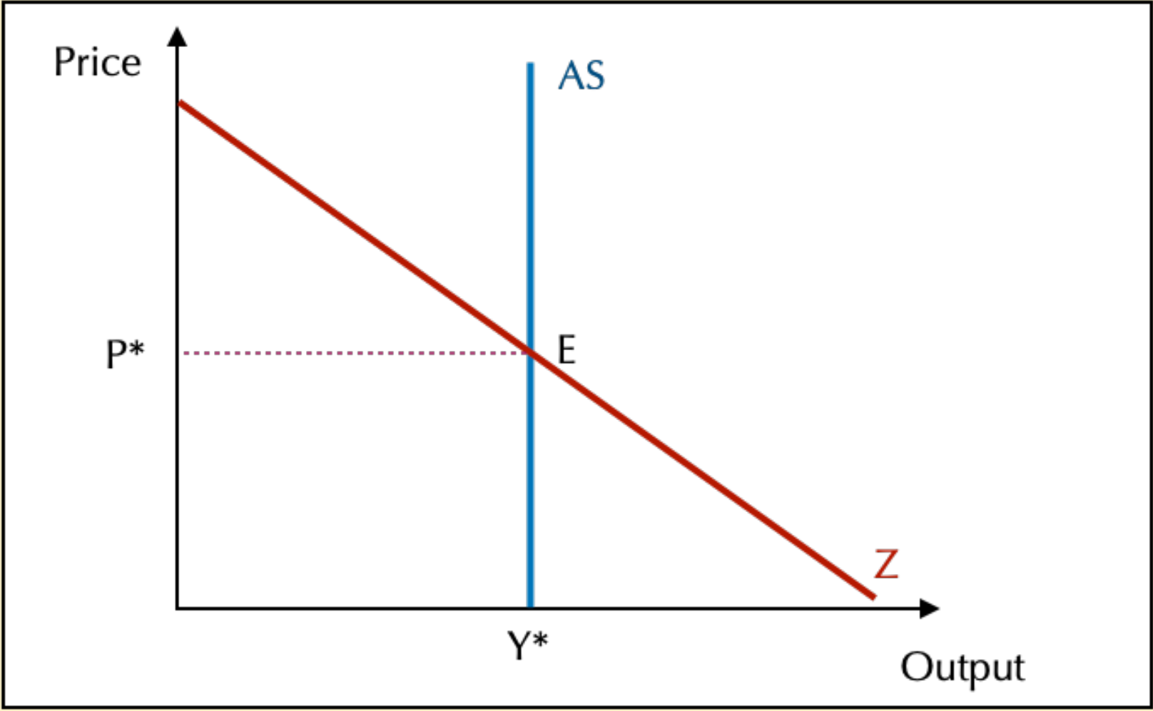 The idea is that the demand will be higher as the price go lower. The aggregated supply only depend on saves (in the short run) and so is static (again, because of Say's Law).